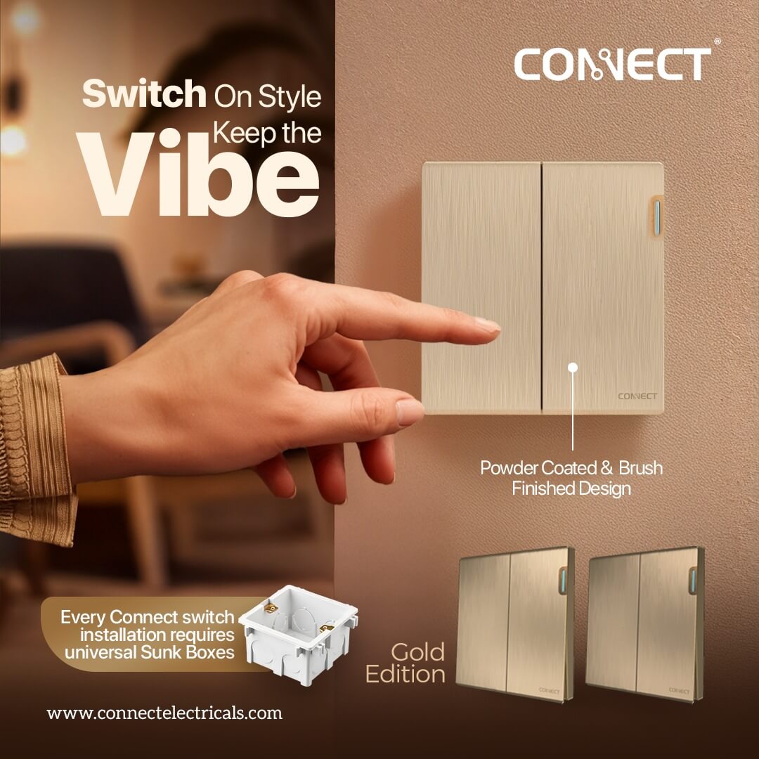 Connect Electricals : A brand of switches that is a combination of quality, sophistication and elegance. Our full button modular is unique to our brand which wows customers. Connect brand focuses not only on safety, but also on the quality and the appearance. Our product portfolio ranges from Premium Gold to Luxury Pearl, which are suitable for all trendy interior designs. Brushed finish of the switch surface adds a royal touch to your living space. Towards win- win objectives, we offer a lifetime warranty which highlights our superior quality.